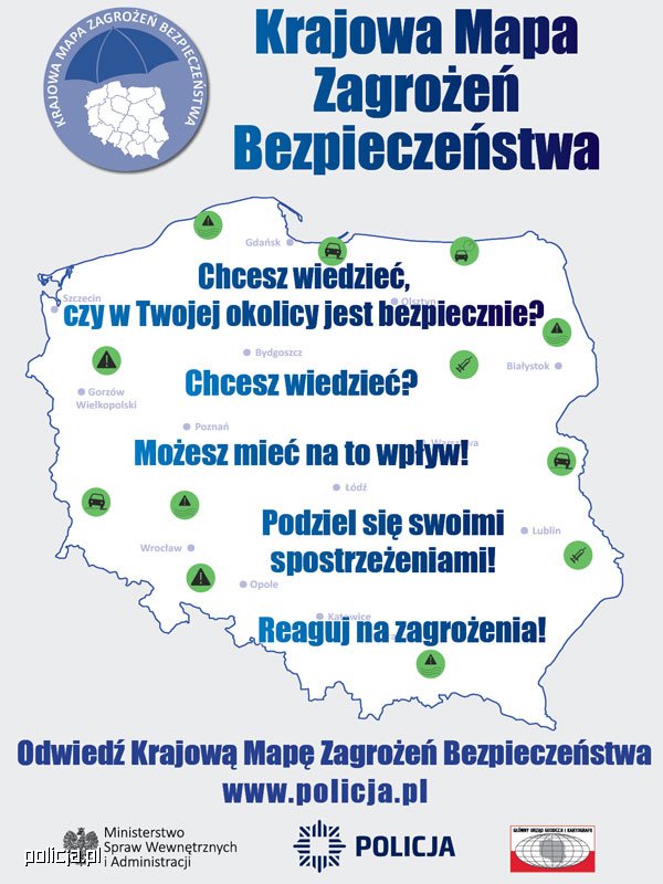 Krajowa Mapa Zagrożeń Bezpieczeństwa to narzędzie pozwalające od ponad 6 lat na komunikowanie się społeczeństwa z Policją. Ta bieżąca informacja o zagrożeniach oraz etapach ich eliminacji pozwoliła dotychczas rozwiązać lokalne problemy w wielu obszarach życia. Spośród dostępnych do wyboru 24 kategorii zagrożeń najczęściej wybierane są te, które dotyczą bezpieczeństwa w ruchu drogowym jak: Nieprawidłowe parkowanie, Przekraczanie dozwolonej prędkości czy Niewłaściwa infrastruktura drogowa. Prawie 1,5 mln zagrożeń z tych kategorii stanowi ponad 60% wszystkichnaniesionych na mapę zagrożeń. W omawianych kategoriach ponad 800 tysięcy zagrożeń w wyniku podjętych przez Policję działań zostało skutecznie wyeliminowanych. Biorąc pod uwagę wszystkie zagrożenia, które dzięki aktywności społeczeństwa zostały wskazane na Krajowej Mapie Zagrożeń Bezpieczeństwa, ponad 51% z nich zostało potwierdzonych, a następnie wyeliminowanych w wyniku działań Policji.