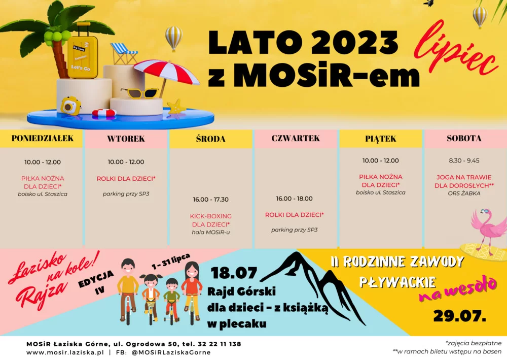 Jak co rok Miejski Ośrodek Sportu i Rekreacji w Łaziskach Górnych przygotował dla najmłodszych mieszkańców naszego miasta propozycje aktywnego spędzenia wakacyjnego czasu. MOSiR zaprasza wszystkie dzieci na bezpłatne zajęcia sportowe, które będą się odbywały przez cały lipiec.