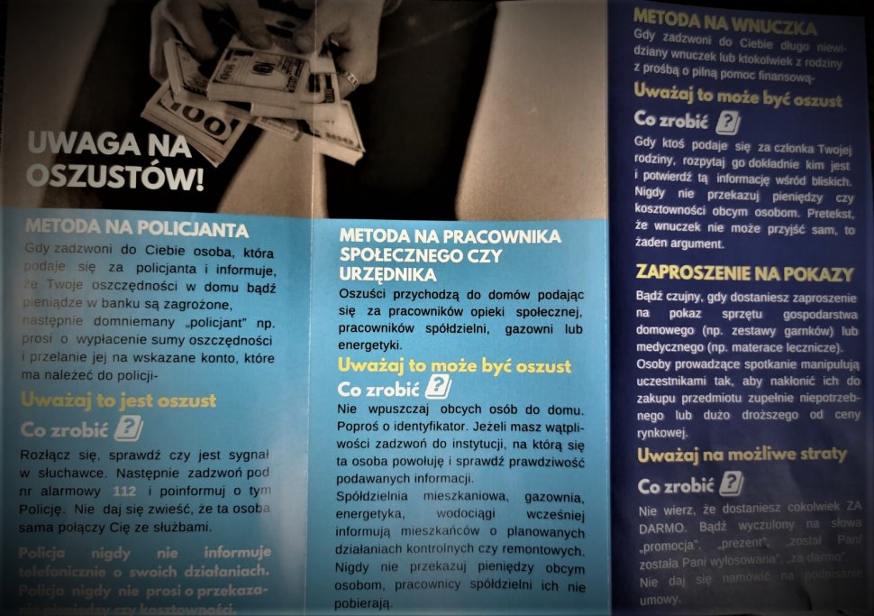 By nie dać się oszukać, nieważne pod jaką legendą. Aktywność i pomysłowość oszustów bowiem nie maleje. Tak samo jak aktywność dzielnicowego z Komisariatu Policji w Łaziskach Górnych, który w trosce o miejscowych seniorów z informacją o aktualnych zagrożeniach stara się dotrzeć do nich w każdy możliwy sposób. Kompendium wiedzy w wersji niewielkiej ulotki powstało przy współpracy mikołowskiej Policji ze Starostwem Powiatowym w Mikołowie.