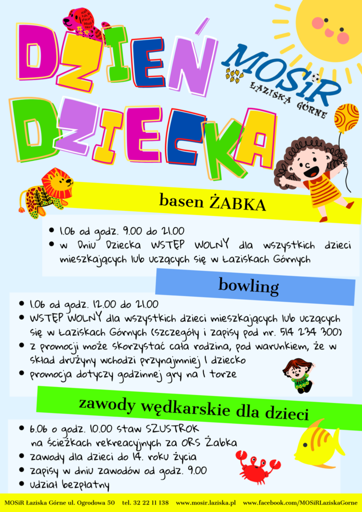 - 1 czerwca – darmowy wstęp na basen Żabka dla wszystkich dzieci mieszkających i uczących się w Łaziskach Górnych,