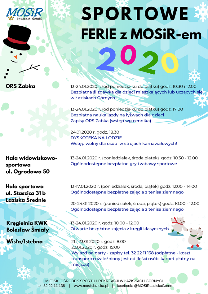 Gry i zabawy sportowe, bezpłatne ślizgawki i nauka jazdy na łyżwach dla dzieci, tenis ziemny, kręgle klasyczne, wyjazdy na narty... a na zakończenie DYSKOTEKA NA LODZIE – to propozycje MOSiR-u na ferie zimowe.Zapraszamy do wspólnej zabawy!Tagi: ferie mosir
