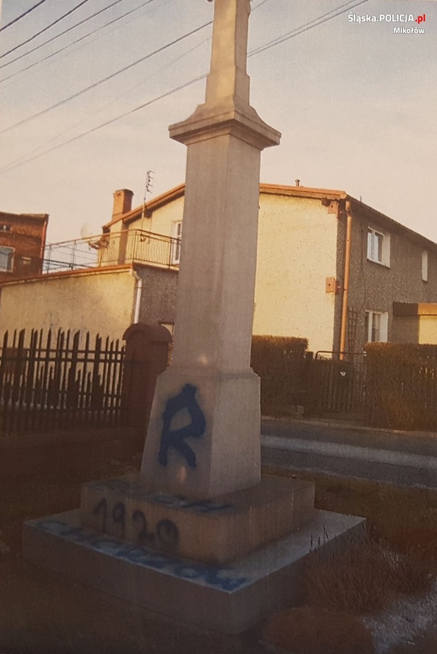 Do zniszczenia pomnika doszło 19 lutego br., kiedy to dotychczas nieznani sprawcy uszkodzili go poprzez naniesienie na niego napisów farbą. Dzięki wnikliwej pracy policjantów mikołowskiego Wydziału do Walki z Przestępczością Gospodarczą doszło przedwczoraj do ustalenia dwóch sprawców tego niegodziwego czynu. Okazali się nimi dwaj osiemnastoletni mieszkańcy Łazisk i Mikołowa. Sprawa ma charakter szczególny z uwagi na to, że mężczyźni za ten czyn odpowiedzą z Ustawy o Ochronie zabytków i opiece nad zabytkami. Wczoraj "graficiarze" usłyszeli prokuratorskie zarzuty, do których popełnienia obaj się przyznali. Teraz za swoje zachowanie odpowiedzą przed mikołowskim sądem.