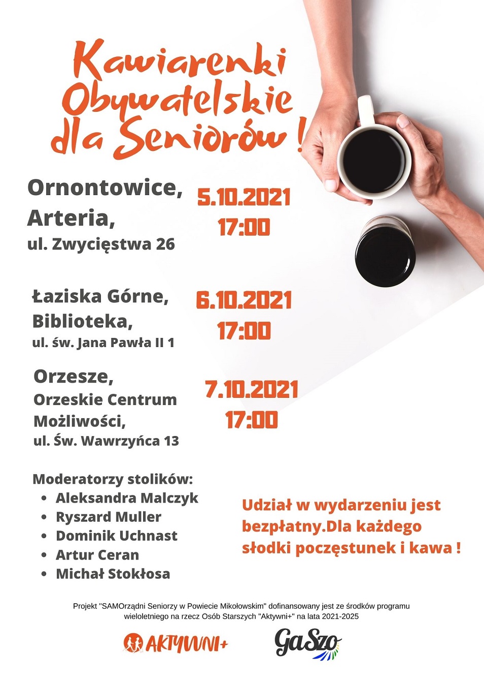 W środę 5 października w Łaziskach Górnych odbędzie się Kawiarenka Obywatelska dla Seniorów. Start o godzinie 17:00 w Bibliotece przy ulicy Jana Pawła II.