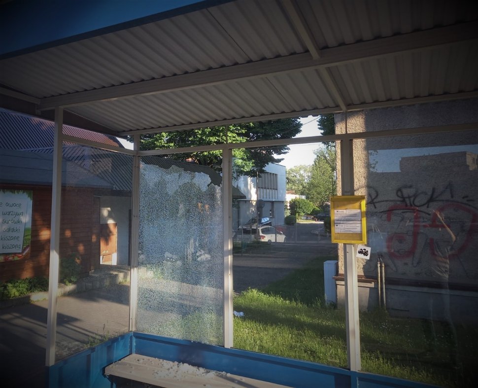 • uszkodzenie szyby wiaty przystanku miejskiego;