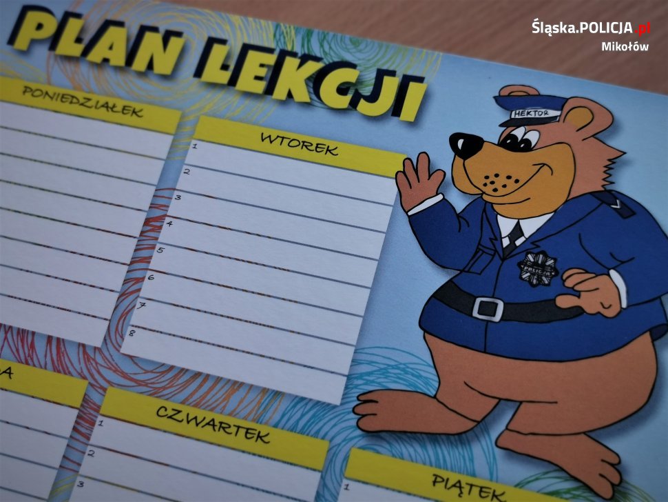 Na koniec spotkania dzieci otrzymały karty planu lekcji z wizerunkiem doskonale znanej im maskotki mikołowskiej Policji - sierżantem Hektorem.