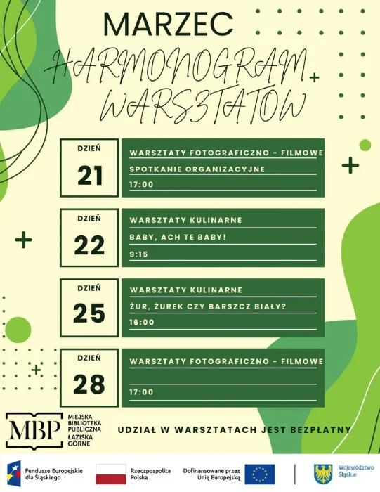 Miejska Biblioteka Publiczna w Łaziskach Górnych przedstawiła harmonogram warsztatów fotograficznych i kulinarnych zaplanowanych na marzec 2025 r. realizowanych w ramach projektu „Transformacja na terenie miasta Łaziska Górne” współfinansowanego z Funduszy Europejskich w ramach Programu „Fundusze Europejskie dla Śląskiego 2021–2027” dla Priorytetu: FESL.10.00 Fundusze Europejskie na transformację dla Działania: FESL.10.24 Włączenie społeczne – wzmocnienie procesu sprawiedliwej transformacji.