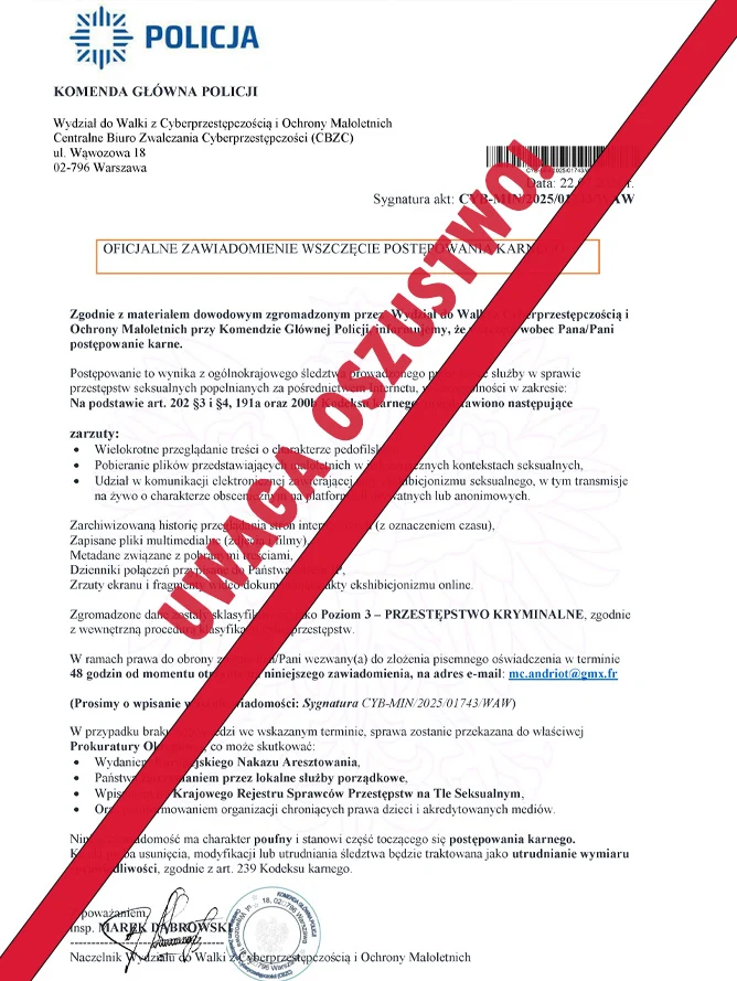 Na skrzynki mailowe Polaków trafiają fałszywe wiadomości od rzekomej Policji lub EUROPOLU. Ich treść sugeruje, że odbiorca jest podejrzany o udział w przestępstwach seksualnych. W mailach znajdują się również załączniki – rzekome „dowody” – które w rzeczywistości mogą zawierać groźne oprogramowanie szpiegujące lub szyfrujące dane.