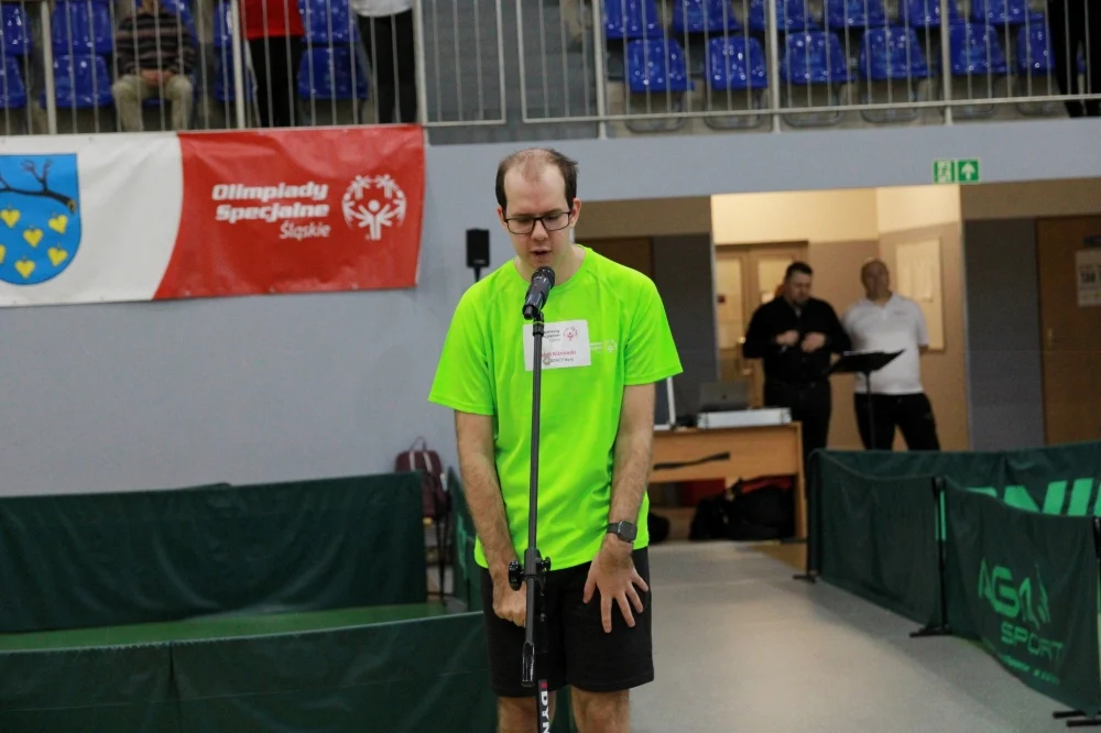 Przed rozpoczęciem rozgrywek, Jakub Wiśniowski z Klubu Pogromcy Wyry poprowadził uroczystą przysięgę, która na stałe wpisała się w tradycję Olimpiad Specjalnych. Słowa przysięgi, które wybrzmiały w hali: „Pragnę zwyciężyć, lecz jeżeli nie będę mógł zwyciężyć, niech będę dzielny w swoim wysiłku,” podkreśliły, czym jest ta rywalizacja. To nie tylko o sport, ale o pokonywaniu swoich granic i dawanie z siebie wszystkiego.