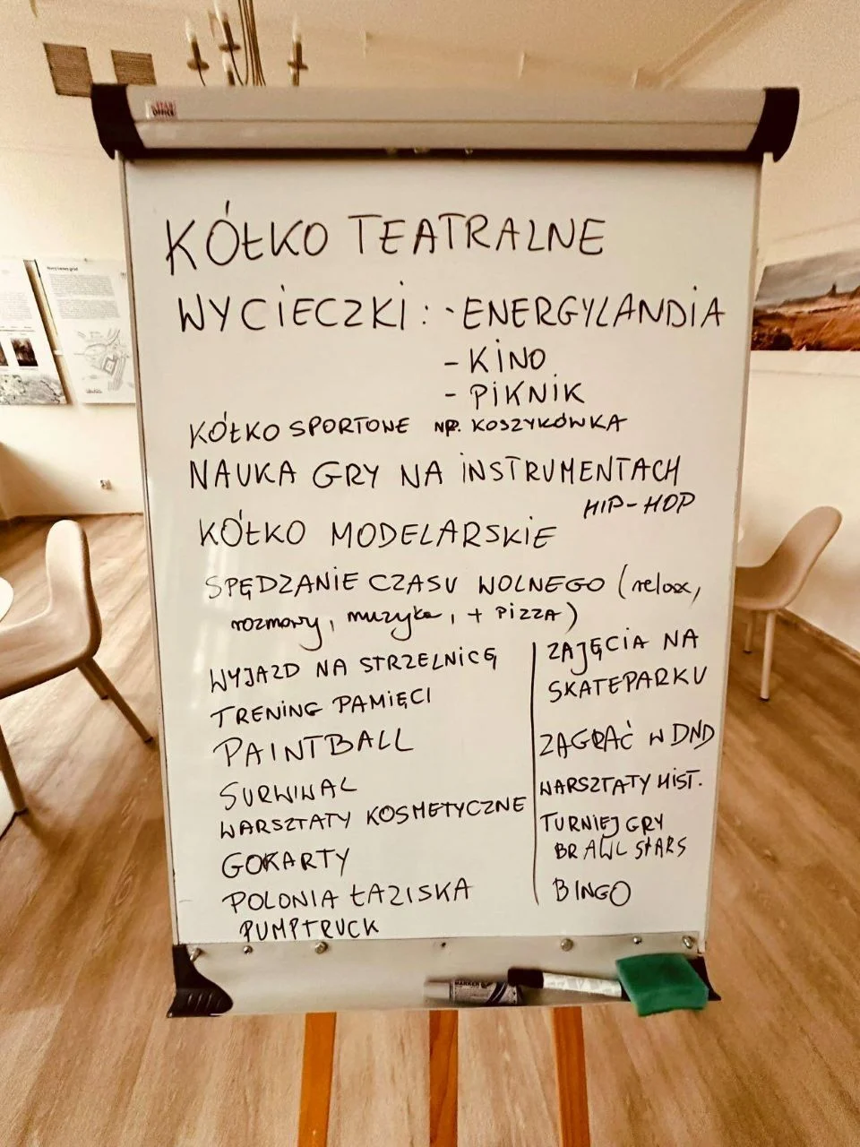 Młodzież miała mnóstwo pomysłów – od wycieczek, kółka sportowego, nauki gry na instrumentach, przez wyjazdy na strzelnicę, paintball, gokarty, aż po warsztaty kosmetyczne, warsztaty historyczne i modelarskie, sesje Dungeons & Dragons i survival na hołdzie.
