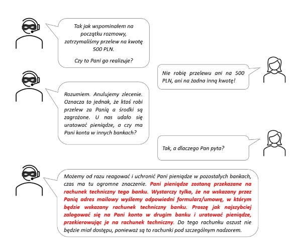 Po nawiązaniu połączenia telefonicznego i przekazaniu informacji o rzekomym zagrożeniu dla naszych pieniędzy scenariusz może wyglądać tak:
