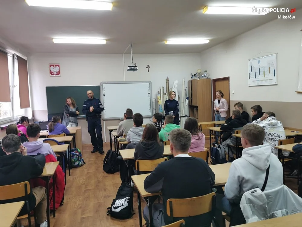 Spotkania z młodzieżą to doskonała okazja do promowania zawodu policjanta. Dlatego też mundurowi z mikołowskiej jednostki chętnie uczestniczą w dniach otwartych szkół, targach pracy i edukacji oraz różnych innych spotkaniach z młodymi ludźmi, gdzie mogą opowiadać o tym co robią. Wczoraj rano mł.asp. Artur Ceran oraz st.sierż. Izabela Kempka z Wydziału Prewencji Komendy Powiatowej Policji w Mikołowie spotkali się z uczniami technikum łaziskiej placówki. Była to świetna okazja, aby porozmawiać o ich dalszych planach na przyszłość. Podczas wizyty policjanci przedstawili wymagania stawiane przed kandydatami, którzy chcą wstąpić w szeregi Policji. Omówiono wymogi formalne oraz procedurę kwalifikacyjną, która skład się z kilku etapów, w tym badań psychologicznych, testu wiedzy, testu sprawności fizycznej i badań lekarskich, podkreślając, że służba w Policji wiąże się z dużą odpowiedzialnością, ale również daje mnóstwo satysfakcji.