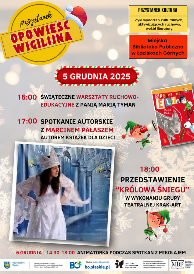 MBP w Łaziskach Górnych zaprasza 5 grudnia na Przystanek Opowieść Wigilijna: warsztaty, spotkanie z Marcinem Pałaszem i spektakl „Królowa Śniegu”.