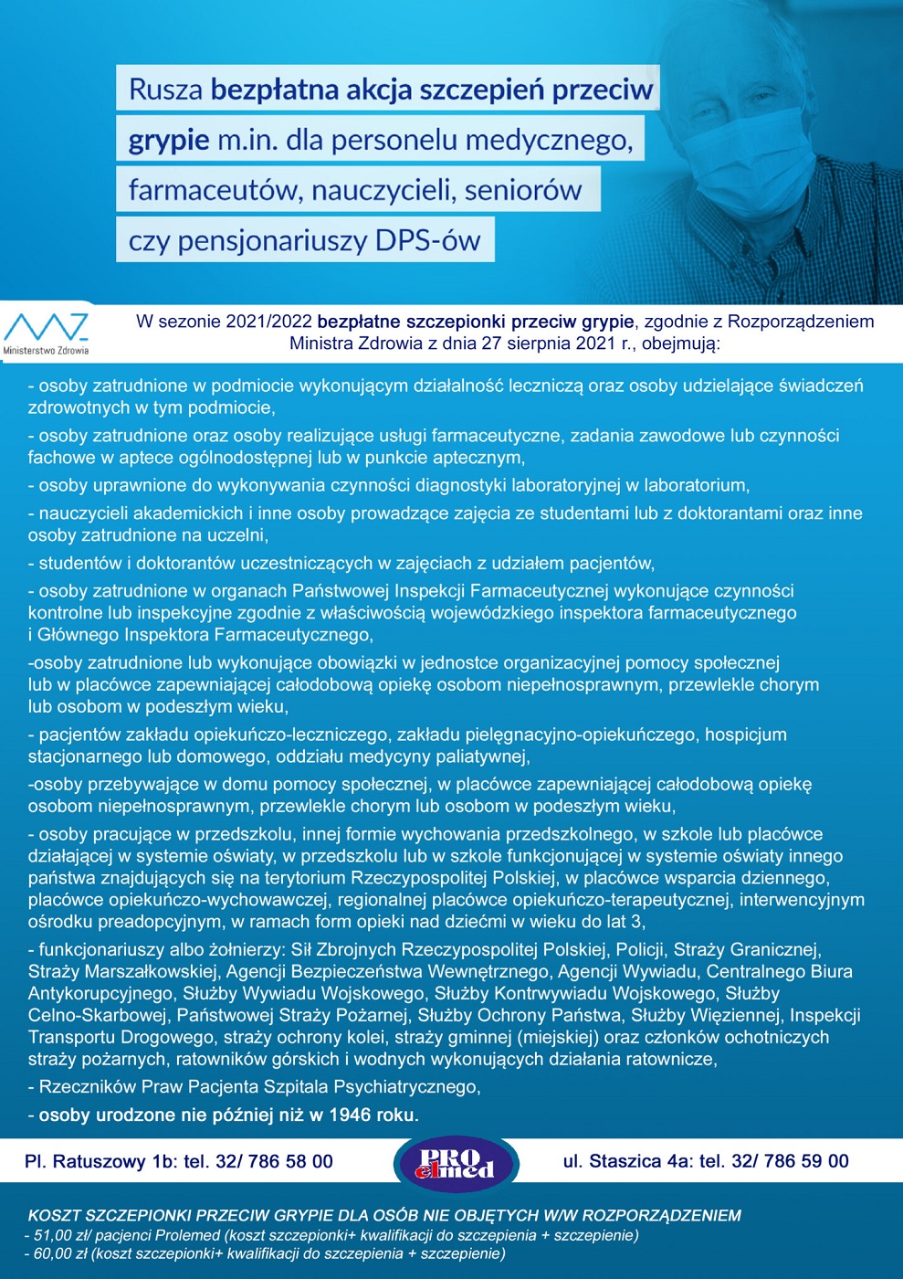 Rusza bezpłatna akcja szczepień przeciwko grypie, między innymi dla personelu medycznego, farmaceutów, nauczycieli, seniorów i pensjonariuszy DPSów.Szczegóły akcji na plakacie poniżej.