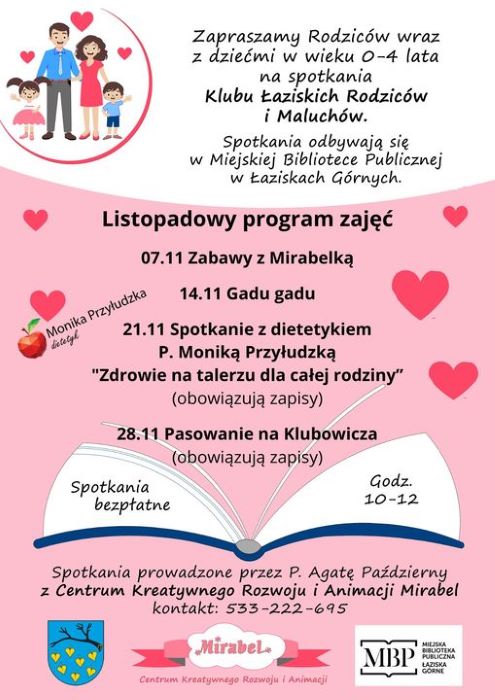 Klub Łaziskich Rodziców i Maluchów zaprasza rodziców wraz z dziećmi na spotkania organizowane w Miejskiej Bibliotece Publicznej w Łaziskach Górnych.