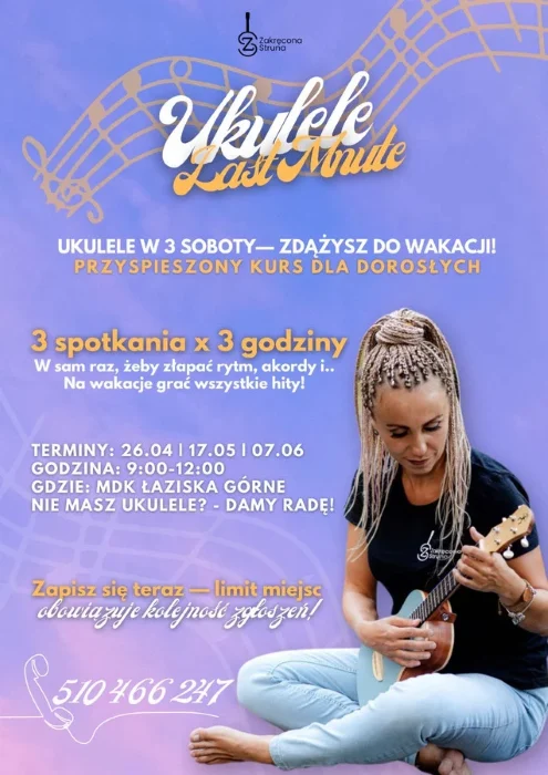 Organizatorzy zapraszają na intensywny kurs gry na ukulele: 3 spotkania x 3 godziny. Dzięki zajęciom nauczysz się grać swoje ulubione melodie jeszcze przed wakacjami. Zapisz się już dziś i rozpocznij swoją muzyczną przygodę. To doskonała okazja, by nauczyć się czegoś nowego, a może nawet zaskoczyć swoich znajomych latem, grając przy ognisku.