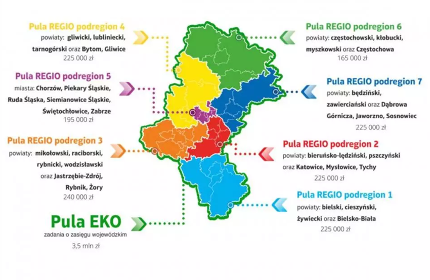 - powiaty bieruńsko-lędziński, pszczyński oraz miasta na prawach powiatu: Katowice, Mysłowice, Tychy (15%): 225 000,00 zł,