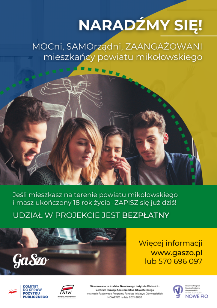 Fundacja GaSzio zaprasza do udziału w wyjątkowej inicjatywie – projekcie pt. „naRADźmy się! – MOCni, SAMOrządni, ZAANGAŻOWANI mieszkańcy powiatu mikołowskiego”, który realizowany jest w ramach Programu Inicjatyw Obywatelskich NOWEFIO na lata 2021-2030 w okresie od 1 sierpnia 2022 roku do 31 października 2024 roku.