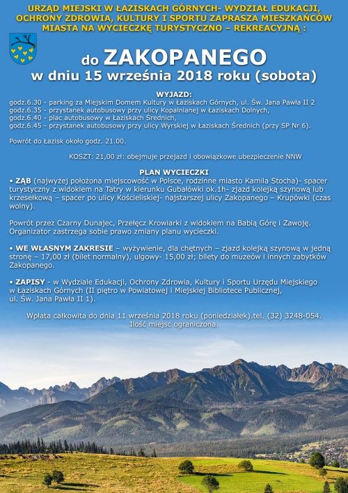 URZĄD MIEJSKI W ŁAZISKACH GÓRNYCH- WYDZIAŁ EDUKACJI, OCHRONY ZDROWIA, KULTURY I SPORTU ZAPRASZA MIESZKAŃCÓW MIASTA NA WYCIECZKĘ TURYSTYCZNO – REKREACYJNĄ :