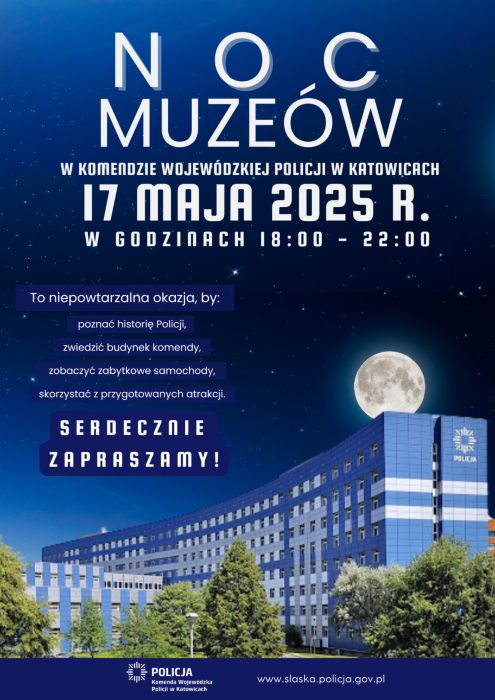 W tym roku Komenda Wojewódzka Policji w Katowicach po raz pierwszy dołącza do grona instytucji uczestniczących w ogólnopolskiej Nocy Muzeów. To niepowtarzalna okazja, by zajrzeć za kulisy codziennej pracy śląskich policjantów, poznać historię i tradycję naszej formacji oraz zobaczyć, jak wygląda współczesna służba.